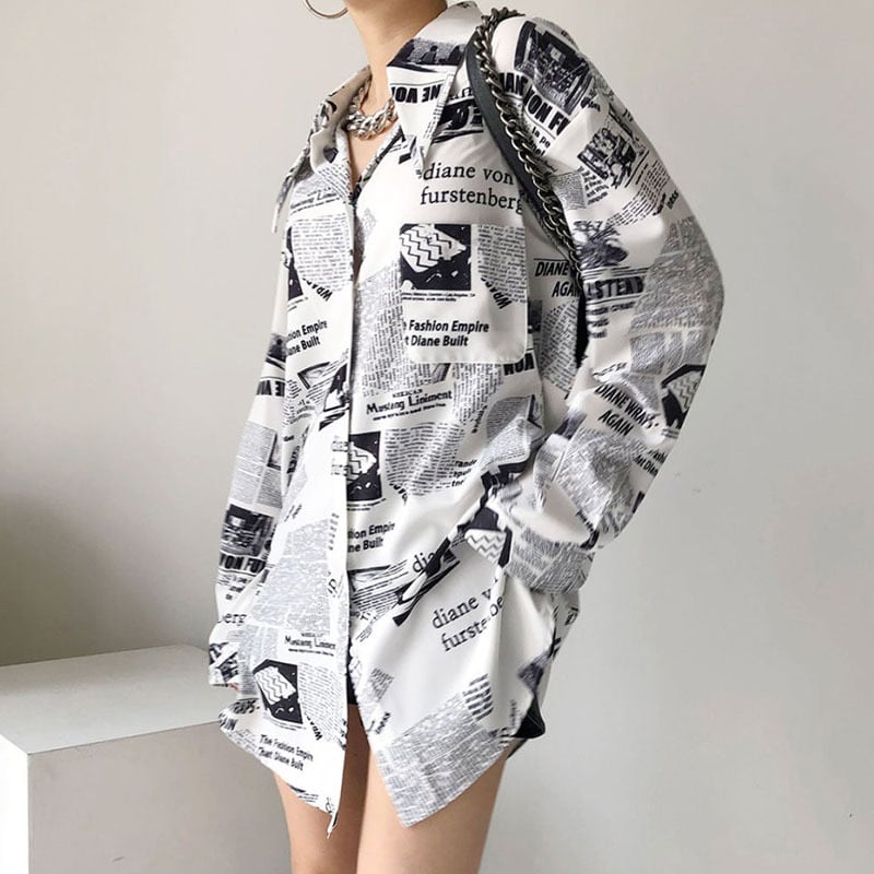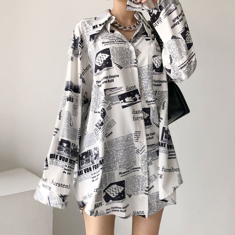 少し長めがうれしい春ブラウス 英字がファッションのポイントになります。