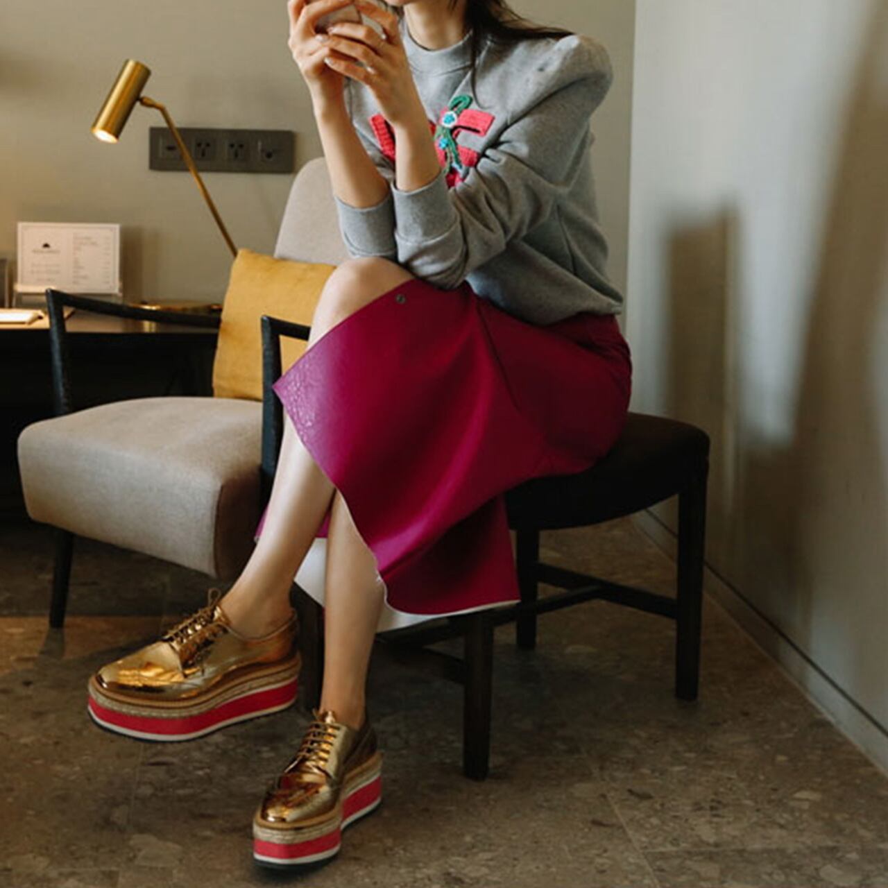 ニット:グレー/スカート:ローズピンク