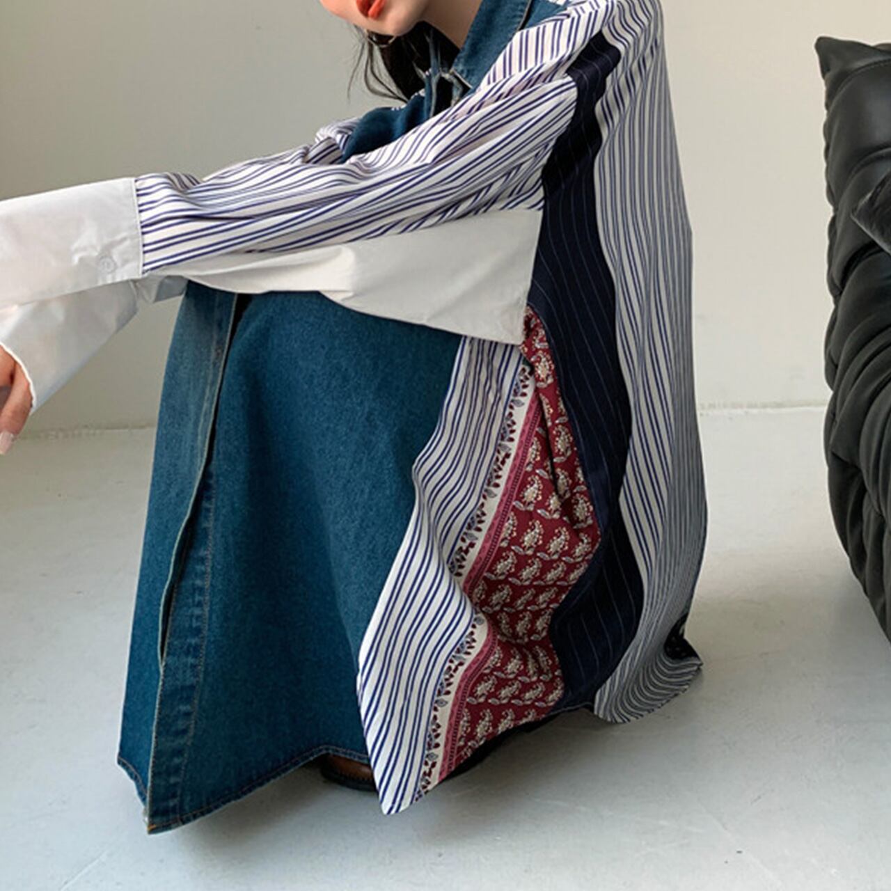 ★デニム 切り替え ブラウス 春トップス★ バックスタイルのおしゃれな切り替えブラウスです。カジュアな中に個性的な方におススメです 【サイズ】 サイズ 着丈90,袖丈64,肩幅46,バスト138 採寸方法によって多少の誤差が発生いたします。 ディスプレイによって発色が異なる場合がございます。