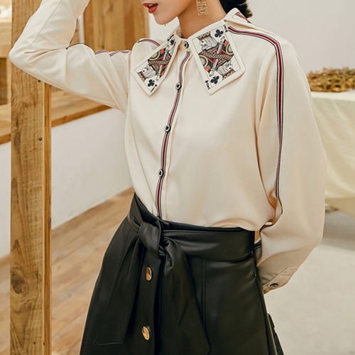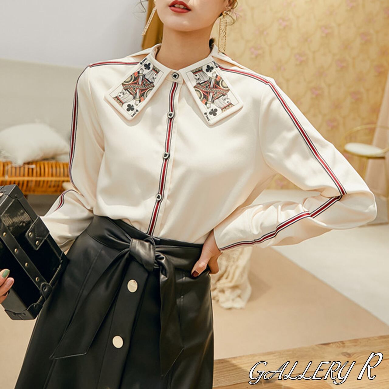 トップス シャツブラウス トランプ襟 とっても個性的でかわいいブラウスです。韓国らしい個性的なブラウスです。 【サイズ】 S:バスト94、肩幅38、着丈58、袖丈61 M:バスト98、肩幅39、着丈60、袖丈62 L:バスト102、肩幅40、着丈62、袖丈63 採寸方法によって多少の誤差が発生いたします。 ディスプレイによって発色が異なる場合がございます。