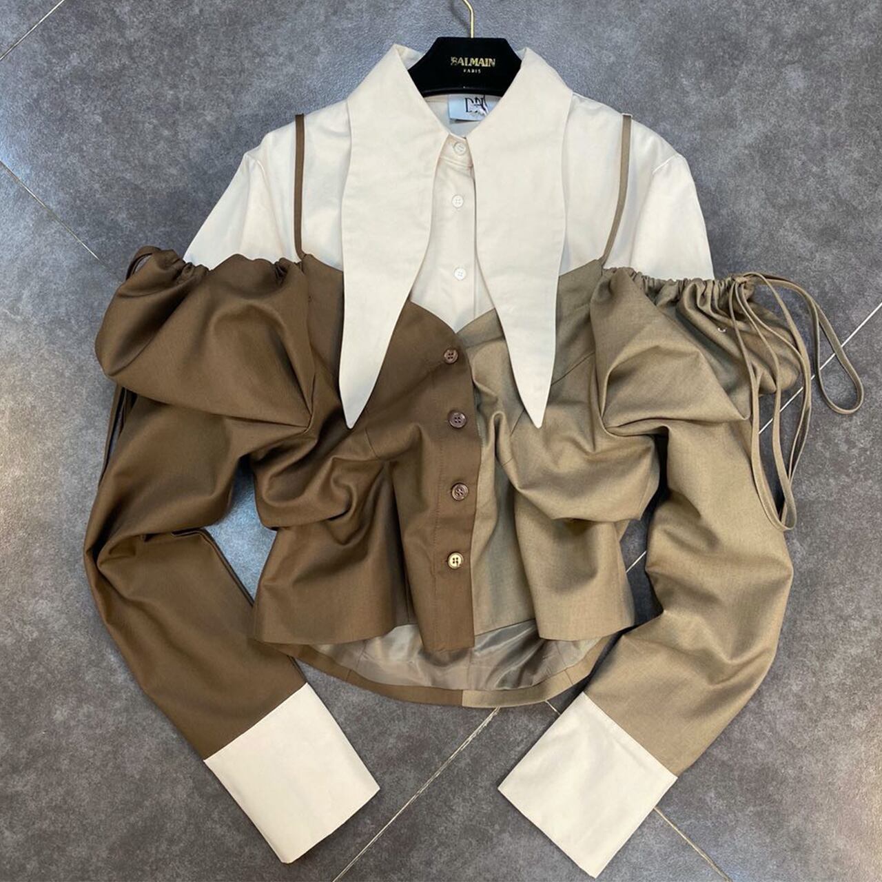 重ね着風シャツ シャツブラウス ブラウス 可愛いシャツブラウスです。 三角襟も2021SSらしいシャツブラウスです。 【カラー】 ブラック/モカ 【サイズ】 S、M、L ディスプレイによって発色が異なる場合がございます。